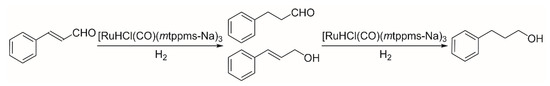 - Andriollo, A.; Carrasquel, J.; Marino, J.; López, F.A.; Páez, D.E.; Rojas, I.; Valencia, N. On the synthesis and characterization of two ruthenium water-soluble complexes: Preliminary results on the hydrogenation of cinnamaldehyde in a biphasic system. Surface activity of the ligands TPPMS and TPPTS. J. Mol. Catal. A: Chemical 1997, 116, 157–165. [Google Scholar] [CrossRef]