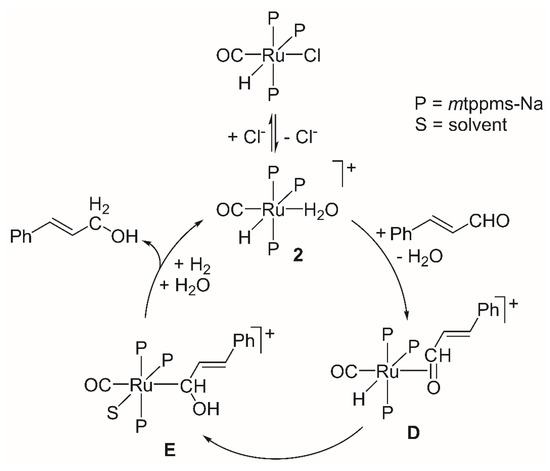 2.2.3. Mechanism of Cinnamaldehyde Hydrogenation Catalyzed by [RuHCl(CO)(mtppms-Na)3], 1, in Aqueous–Organic Biphasic Solvent Mixtures
