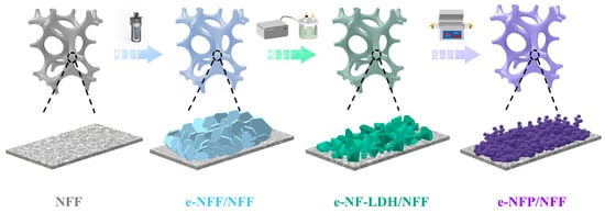As illustrated in Figure 1, e-NFP/NFF catalysts were synthesized in a three-step hydrothermal–electrodeposition–phosphorization process. First, e-NFF/NFF catalyst, a layered material consisting of hierarchically interwoven nanosheets, was in situ grown on the porous conductive NiFe alloy foam substrate (NFF) through a simple hydrothermal alkali-etching method, where NFF not only serves as a substrate, but also as a provider of metal ions. Then, when a constant voltage of −1 V was applied to the e-NFF/NFF electrode for 200 s at 30 °C during the electrodeposition process, NiFe-LDH precursors were synthesized on the surface of e-NFF/NFF (denoted as e-NF-LDH/NFF). Finally, to introduce the transition metal P, a facile annealing treatment with sodium hypophosphite as the P source under the flowing Ar atmosphere was conducted. The color change (from yellow to slight yellowish-green and further to black) of the NFF substrate indicated the transformation and formation of e-NFP/NFF electrocatalysts.