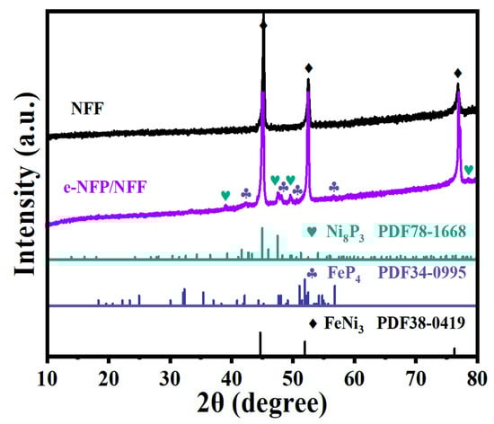 The phases and crystal structures of as-prepared samples were further determined by X-ray diffraction (XRD). The diffraction patterns of NFF and e-NFP/NFF are shown in Figure 4, where the strong characteristic peaks located at 44.3°, 51.8°, and 76.4° were derived from the substrate of NFF, corresponding to its (111), (200), and (220) crystal planes, respectively, (PDF#38-0419). The quite weak diffraction peaks at 39.3°, 47.6°, 49.6°, and 78.4° were indexed to the (0,2,10), (300), (1,2,11) and (2,2,21) crystal planes of hexagonal Ni8P3, respectively, (PDF#78-1668), while the weak peaks located at 42.3°, 48.2°, 51.1°, and 56.9° were assigned to the (052), (240), (−213), and (−261) crystal planes of orthorhombic FeP4, respectively, (PDF#34-0995). [,,,]. There were no diffraction peaks corresponding to other impurity phases, except for the above-mentioned diffraction peaks. Table S1 also summarizes the locations of peaks and the corresponding attributions for e-NFP/NFF. In addition, Figure S3 shows the XRD patterns comparison of the prepared samples at each step. Apparently, the absence of diffraction peaks assigned to the products after alkali etching and no typical peaks of electrodeposited NiFe LDH nanosheets could be attributed to the worse crystallinity and smaller size of the products [,]. To better verify the formation of NF-LDH on the e-NFF/NFF during electrodeposition, the Raman spectra of e-NFF/NFF, a-NF-LDH/NFF, and e-NF-LDH/NFF were conducted (Figure S4). Evidently, there are obvious characteristic peaks over the range of 200~800 cm−1. The Raman spectrum of e-NF-LDH/NFF presented all the signals of e-NFF/NFF and a-NF-LDH/NFF [,,]. Combined with the change of SEM images of e-NFF/NFF (Figure S2), these observations verified that NiFe-LDH was successfully loaded on the e-NFF/NFF.