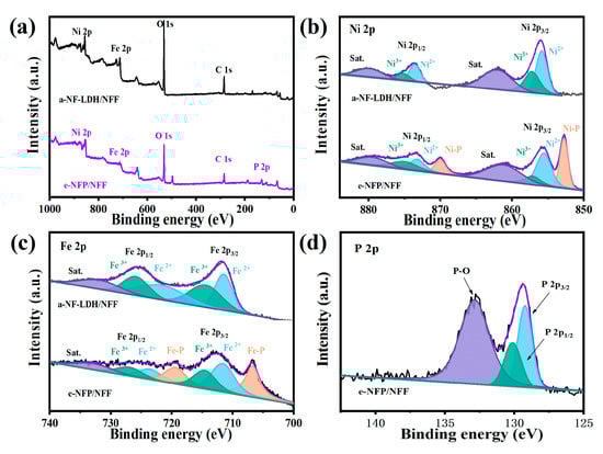 XPS analysis: (a) XPS survey spectra of a-NF-LDH/NFF and e-NFP/NFF; and high-resolution spectra of (b) Ni 2p, (c) Fe 2p, and (d) P 2p.