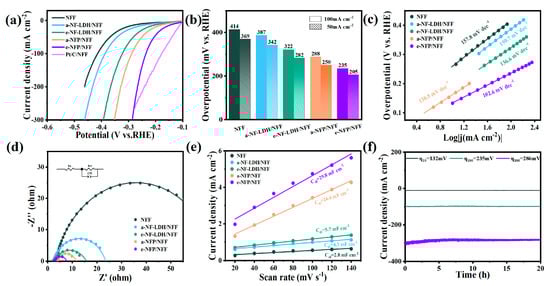 (a) HER polarization curves with iR−compensation for Pt/C/NFF, NFF, a−NF−LDH/NFF, e−NF−LDH/NFF, a−NFP/NFF and e–NFP/NFF; (b) overpotentials at 50 and 100 mA·cm−2; (c) Tafel plots of the corresponding samples; (d) Nyquist plots; (e) Cdl of the corresponding samples; (f) time−dependent current density curve of e–NFP/NFF at overpotentials of 132, 235, and 286 mV.