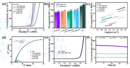To evaluate the potential of e-NFP/NFF electrocatalyst for OWS, we further tested the catalytic performance of the above catalysts for OER under the same experimental conditions. The corresponding iR-corrected LSV curves are shown in Figure 7a, and the overpotentials at output current densities of 50 and 100 mA·cm−2 are further summarized in Figure 7b. As a comparison, the polarization curves of benchmark RuO2 catalyst under the same mass loading were also explored. As expected, the e-NFP/NFF catalysts exhibited excellent OER performance with the lowest overpotentials of 257 and 272 mV at current densities of 50 and 100 mA·cm−2, respectively, which were better than those of a-NF-LDH/NFF (286 and 304 mV for 50 and 100 mA·cm−2). Even at the commercially required high current density of 300 mA·cm−2, e-NFP/NFF still showed low overpotential. The Tafel plots obtained from the corresponding polarization curves were utilized to reflect the rate of oxygen evolution as well as evaluating the reaction dynamics of OER. As depicted in Figure 7c, the e-NFP/NFF presented the smallest Tafel slope of 49.6 mV·dec−1 among all the samples, suggesting the rapid OER kinetics of the e-NFP/NFF. Both the lowest overpotential and the smallest Tafel slope confirmed that the catalyst possessed excellent OER catalytic activity in alkaline solutions. The comparison of the OER catalytic performance of e-NFP/NFF catalyst with other relevant non-precious metal electrocatalysts reported in the literature is also presented in Table S3, which further points out that the OER property of the e-NFP/NFF catalyst were satisfactory. The Nyquist plot based on an EEC (Figure 7d) demonstrates that the semicircle diameter of e-NFP/NFF was the smallest among the five catalysts, indicating it possessed the lowest Rct and fastest charge transfer. The impedance values of the catalysts are consistent with the trends of the LSVs and Tafel slopes described above. It could be concluded that the potential barrier of the e-NFP/NFF was reduced by enhancing the conductivity of the catalysts, which led to the improvement of the OER efficiency. Furthermore, the TOF value of e-NFP/NFF for OER are also the largest, compared with other counterparts (Figure S21).