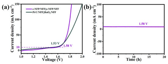 In light of the outstanding HER and OER performances, a two-electrode electrolyzer configuration for OWS was constructed by employing e-NFP/NFF as both the anode and cathode in 1 M KOH aqueous solution (labeled as e-NFP/NFF||e-NFP/NFF). As exhibited in Figure 8a, the fabricated water electrolysis device can achieve a current density of 10 mA·cm−2 with a low voltage of 1.58 V, which was close to that of the benchmark Pt/C||RuO2 electrode (1.53 V). Furthermore, the OWS activity of e-NFP/NFF||e-NFP/NFF was also comparable to most of the recently reported results summarized in Table S4. Significantly, the e-NFP/NFF||e-NFP/NFF couple displayed excellent long-term durability, with negligible degradation of the current density after OWS testing for 20 h (Figure 8b). This undoubtedly confirmed that e-NFP/NFF is a promising bifunctional electrocatalyst with great potential for application in OWS.