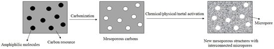Activation techniques, which can be classified into chemical and physical methods, are the most used approaches to prepare mesoporous carbon (Figure 1). The physical activation process includes the thermal pyrolysis of materials at a relatively low temperature (typically 400 to 900 °C) under inert atmosphere (nitrogen or helium) and then the controlled gasification of the obtained chars from carbonization at a higher temperature (800 1000 °C) with oxidizing agents such as water (steam), carbon dioxide, air, or any mixture of these gases to produce the porous structures [41,42]. Unlike commonly applied physical activation, the carbonization and activation in chemical activation are accomplished in one-step process. A typical chemical activation consists of the thermal decomposition of carbon precursor impregnated with suitable chemical agents at temperatures ranging from 400 °C to 700 °C [43]. The most widely used industrial activating agents in the chemical activation process are zinc chloride (ZnCl2), aluminum chloride (AlCl3), magnesium chloride (MgCl2), sodium hydroxide (NaOH), potassium hydroxide (KOH), sodium carbonate (Na2CO3), and phosphoric acid (H3PO4) [43,44]. The type of chemical agent is one of the important and effective parameters of the mechanism and temperature of the activation process. The advantages of physical activation include the greenness of the process, availability of activating agents, and ease of technology. The chemical activation method has various advantages, such as relatively low activation temperature, higher carbon yield, low energy cost, shorter activation time, and the production of mesoporous carbons with a superhigh specific surface area in comparison to the physical activation process [45,46,47]. Generally, in the practical applications, physical and chemical activation procedures are combined to obtain better activation effects.