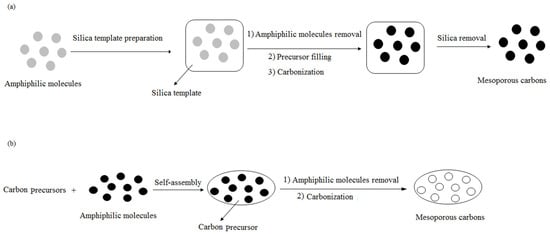 One of the most important and widely used methods for the synthesis of mesoporous carbon with well-controlled mesopores is the templating technique. Two well-established templating approaches, hard- and soft-templating methods, are applied for the preparation of mesoporous carbon (Figure 2). In the soft-templating method, amphiphilic molecules (surfactant molecules or block copolymers, metal organic frameworks), which act as the templates, are first self-assembled with carbon precursor molecules, through hydrogen bonds or other interactions. Subsequently, the amphiphilic molecules can be removed through the calcination process at high temperatures to generate mesopore structures with high controllability in the pore structures and dimensions [49]. In this approach, templates act mainly as molds for the replication of mesoporous carbon materials. The structure of the obtained pores is determined by various parameters, and the most important of them include the molecular properties of the tempering agents, reactant concentrations, solvents, and temperature. The hard-templating method usually uses pre-synthesized organic or inorganic templates such as magnesium oxide, mesoporous silica, and colloidal silica, and the carbon precursors are infiltrated into the pores of the templates. After carbonization under appropriate temperature and template removal through the chemical etching under acid or an alkaline solution, the mesoporous carbon with a large volume and surface area of pores is produced. Compared with the soft-templating approach, the hard-templating approach is more tedious, has a relatively long synthesis time, has greater difficulties in regulating pore size, and has a high production cost [50].
