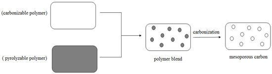 Another method for the preparation of mesoporous carbon materials is carbonization. Carbonization is the conversion of carbon-containing materials into carbonization product under high temperature. Recently, the carbonization of polymer blends composed of a carbonizable polymer and a pyrolyzable polymer has become of interest for the synthesis of porous carbon. A polymer blend is a mixture of two or more types of polymers. When a polymer blend that consists of two types of polymers with different degrees of thermal stability is carbonized, the thermally unstable polymer (pyrolyzable polymer) will be completely eliminated in pyrolysis to leave pores in the carbon matrix of the thermally stable polymer (carbonized polymer) (Figure 3). The size and volume of pores in the final porous carbon can be controlled with the blending ratio of the component polymers [48].