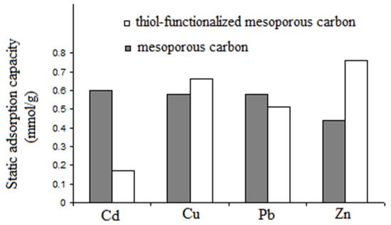 Michalak-Zwierz et al. [63] prepared mesoporous carbons and studied the effect of the functionalization of mesoporous carbon materials with thiol-contained polyhedral oligomeric silsesquioxane (POSS) on the adsorption of heavy-metal ions such as Cu, Zn, Pb, and Cd in water. In their work, ordered mesoporous carbon were obtained by hard templating using SBA-15 and subsequent oxidization by ammonium persulphate. Then, the surface modification of mesoporous carbons was completed by octa(3-mercaptopropyl) polyhedral oligomeric silsesquioxane to decorate the surface with thiol groups. They reported that thiol functionalization did not change the adsorption efficiency of Cu(II) and Pb(II) as compared with pristine mesoporous carbon materials. However, the amount of Cd(II) absorption by thiol-functionalized mesoporous carbon was about four times less than pristine mesoporous carbon, whereas the amount of Zn(II) absorbed by thiol-functionalized mesoporous carbon was two times more than mesoporous carbons (Figure 4). In addition, they showed that the amounts of metal adsorbed (except Cd) in the range of 0–15 mg/L were higher for thiol-functionalized mesoporous carbon as compared with pristine mesoporous carbon. This was attributed to the strong chemical interaction between thiol groups and metal ions.