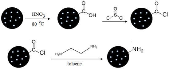 The detection of the level of a reactive oxygen species such as hydrogen peroxide (H2O2) is very important because of the far-ranging impacts of H2O2 homeostasis on human health. On this subject, Wang et al. prepared CdZnSeS quantum dots (QDs) condensed with ordered mesoporous carbon (OMC) and then immobilized them onto a glassy carbon electrode surface to detect hydrogen peroxide in biosensors [109]. They reported that a combination of QDs with the highly conductive mesoporous carbons structures enhanced the electrochemical performance and electrochemical luminescence signal. They found that the produced biosensor had a faster electron transfer rate, a lower detection limit, desirable selectivity, and a long-time stability as compared with a glass carbon electrode. In another study, Jia et al. synthesized mesoporous carbon and used it for the selective determination of dopamine [110]. For this purpose, mesoporous carbon was produced by using mesoporous silica materials SBA-15 as the template and sucrose as the carbon source to modify the surface of a glass carbon electrode for applications in biosensors. The presence of a mesoporous structure improved the electron transfer rate as compared with a glass carbon electrode. This could be attributed to a higher electrochemical surface and larger number of edge plane defect sites on the mesoporous carbon materials. According to their results, the mesoporous carbon-modified electrode revealed high electrocatalytic activities toward the oxidation of dopamine and ascorbic acid and displayed a desirable level of the selective electrochemical determination of dopamine in the presence of ascorbic acid. Song et al. modified a glass carbon electrode by mesoporous carbon and functionalized mesoporous carbon with carboxyl and amino groups for the selective determination of dopamine in the presence of ascorbic acid [111]. The researchers [111] synthesized mesoporous carbon by replacing mesoporous silica SBA-15 using sucrose as the carbon source and then by reacting it with concentrated nitric acid and ethylenediamine to produce carboxyl-modified and amine-modified mesoporous carbon, respectively (Figure 6).