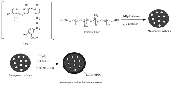 Their results showed that oxidized mesoporous carbon materials had a lower adsorption capacity for hydrophobic hydroxycamptothecin than that of the mesoporous carbons and attributed it to the smaller surface area. Furthermore, the release rate of row drug was improved by the introduction of mesoporous carbon materials. In another study, a drug delivery system based on polyethylene glycol-modified oxidized mesoporous carbon with a narrow size distribution of 90 nm was fabricated for the delivery of doxorubicin [139]. For this purpose, mesoporous carbon was synthesized through the hydrothermal approach and then modified by hydrogen peroxide and polyethylene glycol-modified phospholipid (DSPE-mPEG) (Figure 7). They indicated that prepared nanocarriers showed good stability under neutral pH conditions while releasing the drug in an acidic tumor environment. Furthermore, they showed that mesoporous nanostructures efficiently penetrated the membrane of tumor cells and inhibited the growth of cancer cells both in vitro and in vivo.