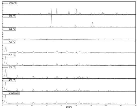The XRPD patterns of the calcined LTX zeolites are shown in Table 1. After calcination at temperatures between 400 and 700 °C, the crystalline structure does not change and matches the pattern of LTX (COD 9005387). The degree of crystallinity (DOC) was calculated by subtracting the instrumental background from the sample’s diffraction pattern, re-determining the background of the measurement, calculating the area below the background curve, and comparing it to the area of the whole pattern of the investigated catalyst. Although the pattern does not change, the crystallinity of the zeolite decreases with higher calcination temperatures. After 2 h at 800 °C, the LTX structure mostly collapses and leads to an amorphous structure. After calcination at 900 °C and especially after calcination at 1000 °C, the structure changes thoroughly to a different crystal structure with high crystallinity (Figure 1 and Figure 2).