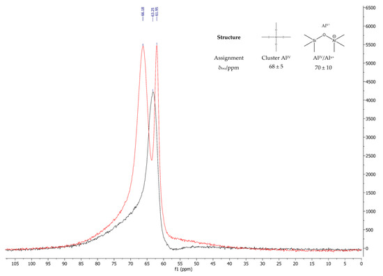 Figure 3 shows the solid-state 27Al NMR spectra of the zeolites calcined at 400 °C and 1000 °C. The spectrum of the calcined zeolite at 400 °C consists only of one signal (at 63.10 ppm) which is related to AlIV clusters [32]. The spectrum of the high-temperature-treated (1000 °C) zeolite shows signals of cluster AlIV at 61.90 ppm and additional framework aluminum atoms in the vicinity of extra-framework aluminum at 66.05 ppm [32]. The change in the shift of the cluster AlIV is caused by the change in the crystal structure.