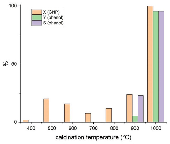 Figure 4 shows the conversion of CHP (X (CHP)), selectivity towards phenol (S (phenol)), and the overall yield of phenol (Y (phenol)) obtained under the same reaction conditions using the catalysts calcined at different temperatures. Conversion, yield and selectivity were estimated based on GC analysis of the product mixture. An exemplary chromatogram and spectrum of the product mixture of one of the experiments is shown in Figure S1 in the supplementary file. Figure S2 in the supplementary file shows the reference spectrum of phenol and the temperature profile of the used GC method.