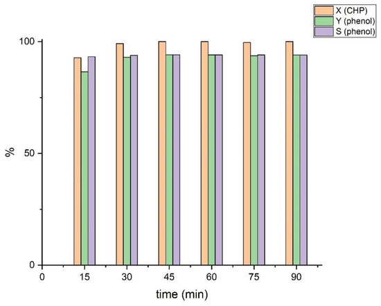 Kinetic studies show that the cleavage of CHP takes place within just a few minutes (Figure 5). The reaction can be run at reaction rates which are comparable with the reaction rates of the sulfuric-acid-catalyzed decomposition of CHP [33].