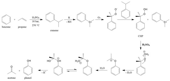 Phenol is one of the most important organic commodity chemicals; with 12.7 × 106 t of phenol and 7.8 × 106 t of acetone produced annually worldwide, the cumene process is still by far the most used process today [1,2]. It was discovered and developed at the same time in the USSR and Germany. In the years 1943–1946, Udris and Sergeev developed a method for the synthesis of phenol and acetone via the acidic decomposition of cumene hydroperoxide (CHP). In 1944, Hock and Lang published a three-step route from benzene and propylene to cumene via alkylation and following autoxidation to CHP, that is cleaved to phenol and acetone via acidic decomposition (Scheme 1) [3,4,5]. The cleavage step is named ‘Hock rearrangement’ and can be catalyzed by Brønsted or Lewis acids [6]. The Hock rearrangement has a major impact on the overall cumene consumption rate of the entire phenol plant [7,8,9,10]. The industrially employed cumene process starts with the alkylation of benzene with propylene to cumene, followed by the oxidation of cumene to CHP in the presence of air and free radical initiators. Once a free radical initiator is added, CHP will catalyze the oxidation reaction [11]. In contrast to typical radical reactions of peroxides (induced by light, heating, or other methods), the cleavage of CHP is a rearrangement of hydroperoxides usually carried out as a sulfuric-acid-catalyzed reaction. The cleavage reaction starts with the protonation of the peroxide, followed by the elimination of water due to the migration of the phenyl group to the peroxide oxygen atom. This forms a carbocation, which is attacked by a water molecule, and one proton switches to the oxygen of the phenyl group it migrated to earlier. This oxonium ion finally decomposes into acetone and phenol [6] (Scheme 1).