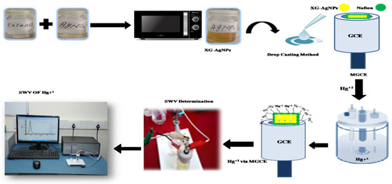 Initially, the GCE (glassy carbon electrode) surface was polished with alumina powder (0.05 µm) until it had a shiny surface. Then, through deionized water, the electrode was washed appropriately. Furthermore, the electrode was subjected to sonication in ethanol and deionized water and then dried under N2. To load the sample on the surface of the GCE, a drop-casting method was used which has been reported previously. A hair dryer was used to dry 10 µL of XG-AgNPs solution drop-cast on a clean GCE surface. After that, 20 µL of 0.2% Nafion solution was applied to the modified GCE. GCE/XG-AgNPs/Nafion was used to symbolize the modified GCE for Hg2+ analysis (Figure 1).