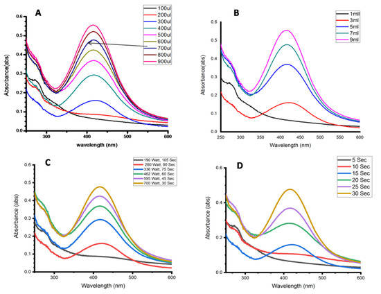 (A) Effect of salt (AgNO3); (B) Effect of xanthan gum (XG); (C) Effect of power; and (D) Effect of irradiation duration on AgNPs.