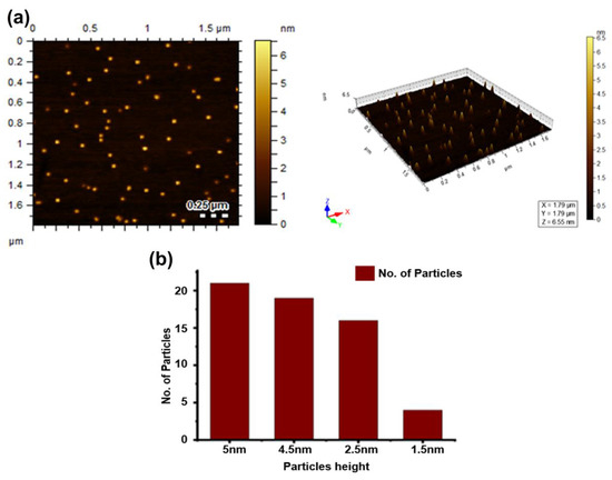 The AFM image of prepared XG-AgNPs is shown in Figure 5A, which allows for the calculation of their average size as well as for views into the surface roughness of the generated XG-AgNPs. The size distribution histogram of the prepared XG-AgNPs against their formation intensity is shown in Figure 5B, with the largest particle excluded by random selection.