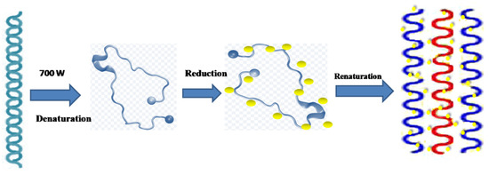 Xanthan gum possesses a five-fold helical structure which is highly ordered but at high power (700 w) denaturation (the process to convert XG into a disordered coil state) occurs, due to the hydroxyl group in xanthan gum structure becoming exposed (Figure 6), and offering their reduction capability for synthesis of AgNPs [21,31]. The carboxylic group of xanthan gum is highly electronegative and played a vital role in preventing the AgNPs from aggregation; because of this, AgNPs remained stable for a longer period of time [21,22,32] (Figure 4). After four weeks of storage at 4 C, the denatured single chains re-associated into a loose, several-fold helix, and as the helix lengthened, larger micro-rods formed. It was observed that AgNPs attached to the xanthan gum chain surface and became trapped in the hydrophobic cavity of the xanthan gum, folded helix [21,26]. Xanthan gum is an economic and ecofriendly polymer and it works as both a reducing as well as a capping agent. Therefore, it is preferred for the synthesis of AgNPs.