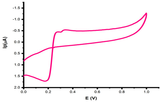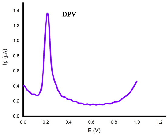 However, the CV of the XG-AgNPs-modified electrode with Hg2+ shows an absence of an anodic peak at 0.23 V roughly and a broad cathodic peak at 0.17 V. In the case of SWV under the same condition, a better anodic peak in terms of intensity of current was obtained, and after repeating the same experiment, the same results were obtained which shows the stability of the modified electrode. DPV was also tried but a small anodic peak of current was obtained in Figure 8. Therefore, SWV was selected to study the anodic peak of Hg+2 for analytical purpose. The anodic peak is caused by the oxidation of Hg0 to Hg2+ in the BRB solution, which formed a complex with the XG-AgNPs modifier, while the cathodic peak is caused by the reduction of Hg2+ to Hg0.