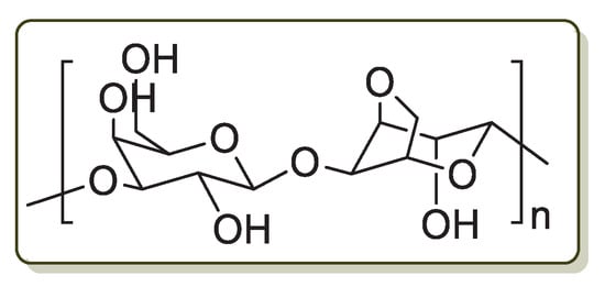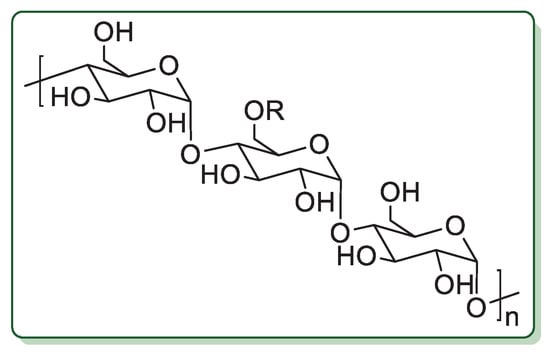 Starch is a complex carbohydrate polymer produced by plants in huge amounts. In starch, (1→4) bonds connect d-glucose molecules. It is composed of two polymers: amylose, a linear polymer forming a helix (Figure 2, R = H), and amylopectin, a highly branched polysaccharide (Figure 2, R = branching polymer chain). Starch is edible, widely used in food, as drug carrier, in papermaking and textile manufactories, in regenerative medicine and the energy industry [,].