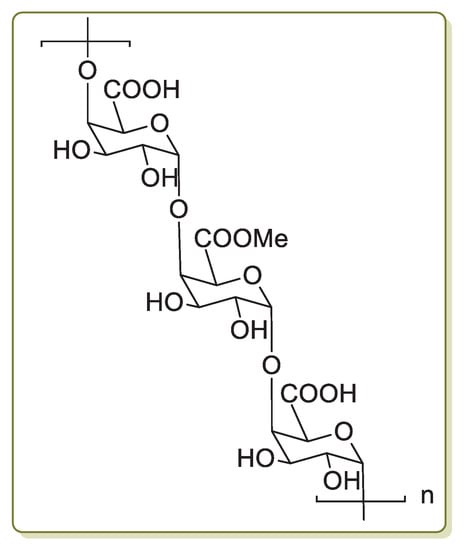 Pectin (Figure 3) is a polysaccharide that is found extensively in plant primary cells. It is a natural polymer employed in the food industry as a gelling, thickening, stabilizing and emulsifying agent. Other major applications of pectin are in the production of packaging materials, edible coatings to protect foodstuff, antimicrobial bio-based films and as healing agents [].