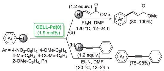 Mizoroki–Heck and Sonogashira reactions of aryl iodides promoted by Pd NPs supported on microcrystalline cellulose (CELL-Pd(0)), reported in 2006 by Reddy and co-workers [].
