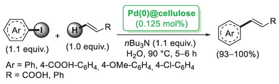 Starting from PdCl2, bulk cellulose-supported Pd(0) was successfully prepared by Cui et al. [] and tested in the Mizoroki–Heck reaction of aryl iodides with styrene performed in H2O as a solvent. The reaction could be carried out in the air and in the presence of a tiny amount of the catalyst (0.125 mol%) with almost quantitative yields (Scheme 2).