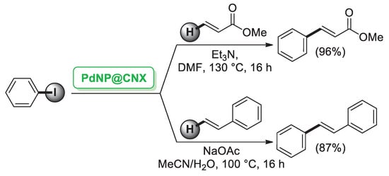 Mizoroki–Heck cross-coupling reaction of iodobenzene with terminal alkenes promoted by Pd nanoparticles supported on cellulose nanocrystals (PdNP@CNX), reported in 2014 by Thielemans group [].