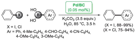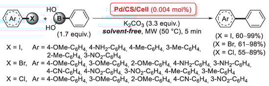 Although the major source of cellulose is plant fiber, cellulose can also be synthetized by fermentation of specific bacteria. Bacterial cellulose (BC) does not contain other components such as lignin, hemicellulose or pectin, so it can be obtained in pure form from the culture media. BC is featured by nanofibers possessing large surface area, high water retention, good mechanical properties and high chemical stability []. Taking advantage of these properties, Tang and co-workers [] employed a BC nanofiber as a matrix for the preparation of supported Pd nanoparticles. Pd/BC was simply generated by mixing PdCl2 or Pd(NO3)2 with BC nanofibers and KBH4 as reducing agent. The catalytic performance of Pd/BC was initially explored in the Suzuki–Miyaura coupling of iodobenzene and different arylboronic acids performed in water medium. A very small amount of catalyst (0.05 mol%) was able to promote the formation of the corresponding diaryl derivatives in almost quantitative yields (Scheme 4). Prompted by these results, the authors extended this methodology to the more challenging reaction of chlorobenzene, achieving good to excellent yields. A palladium leaching test performed after five cycles indicated negligible release of palladium into the solution, probably due to the protection effect of the BC fibers.