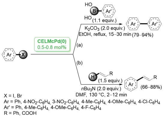 A different method for the preparation of cellulose-stabilized palladium nanoparticles was proposed in 2014 by Li and co-workers [], who obtained microencapsulated Pd NPs by reduction of Pd(OAc)2 dissolved in 1-hydroxylethyl-3-methylimidazolum chloride and cellulose. Slow addition of coagulant ethanol led to the formation of capsules. The average particle size distribution of Pd particles was estimated to be in the range of 5–20 nm. Investigation on the activity of the new cellulose-entrapped catalyst CeLMcPd0 was performed by using Suzuki–Miyaura coupling as a model reaction (Scheme 5a). The CelMcPd0 catalyst was highly effective for both aryl bromides and aryl iodides. Most of these reactions proceeded rapidly and were complete within 30 min. Aryl halides bearing either eletron donating or electron withdrawing substituents displayed similar reactivity, generating the corresponding products in 79–94% yields. Analogously, CelMcPd0 was successfully employed in the Mizoroki–Heck reactions of aryl halides with functionalized olefins (Scheme 5b).
