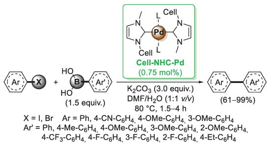 Suzuki–Miyaura reactions of aryl iodides and bromides with arylboronic acids promoted by a cellulose-supported NHC-Pd catalyst (Cell-NHC-Pd), reported in 2014 by Wei and co-workers [].
