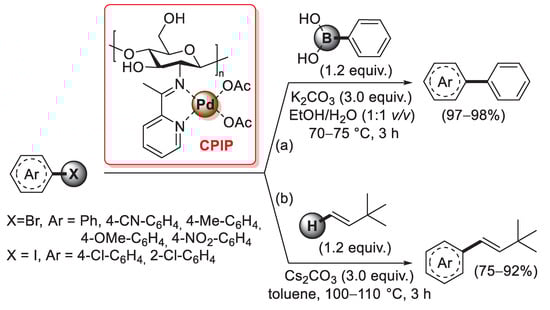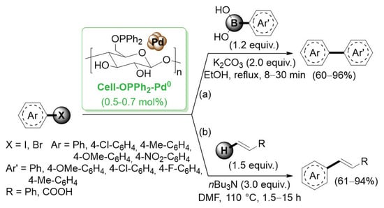 Suzuki–Miyaura and Mizoroki–Heck reactions of aryl halides promoted by a palladium catalyst supported on diphenylphosphinite-functionalized cellulose (Cell-OPPh2-Pd0), reported in 2011 by Li and co-workers [].
