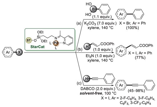 Suzuki–Miyaura, Mizoroki–Heck and Sonogashira cross-coupling reactions of aryl halides promoted by StarCat catalyst, reported in 2005 by Clark and co-workers [].