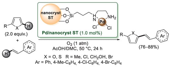 Starch nanocrystals produced via starch acid hydrolysis have a high affinity for transition metals due to the presence of plenty of hydroxyl functional groups. Jain’s group reported the chemical modification of starch nanocrystals using 3-chloropropyltriethoxysilane as a grafting agent []. Chloromethylated nanostarch was then reacted with ethylenediamine to give chemically-functionalized nanocrystalline starch, which was then mixed with [PdCl2(CH3CN)2] in dichloroethane, affording a bright yellow colored nano-starch supported with a palladium complex (Scheme 10). The catalytic activity was investigated in Mizoroki–Heck reactions of furans and thiophenes with styrenes. In all cases, furans and thiophenes were successfully coupled with styrenes to give Mizoroki–Heck-type products in moderate to good yields. The recyclability of the catalyst was checked for the reaction of 2-methylfuran with styrene; the catalyst was easily recovered from the reaction mixture by simple filtration and reused without a noticeable decrease in efficiency over six runs.