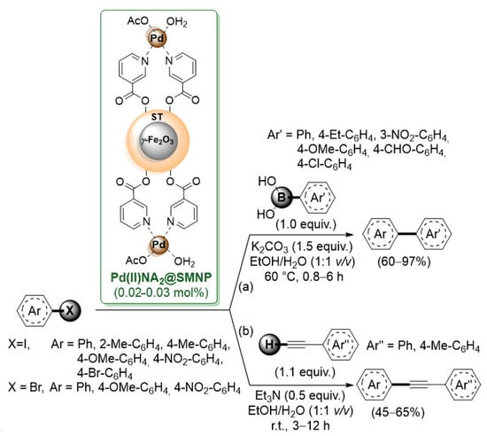 Then, a palladium–niacine complex Pd(II)NA2 was anchored onto this support by means of ester bonds between the -COOH group of niacine and -OH functionalities of starch. Pd(II)NA2@SMNP showed good performance both in the Suzuki–Miyaura (Scheme 11a) and Sonogashira (Scheme 11b) reactions of electron-rich and electron-deficient aryl iodides. The advantages of this heterogeneous system were the use of environmentally benign solvents (EtOH/H2O), the easy separation by an external magnet and its reusability up to six runs.
