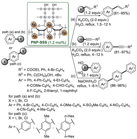 The PNP–SSS catalyst was prepared in three steps. First, activated silica was converted into silica chloride using SOCl2, second, it was reacted with starch in chloroform and triethylamine to obtain the silica–starch substrate (SSS). Finally, the palladium acetate was reduced to Pd nanoparticles (average size 8 nm) using refluxing ethanol, generating the PNP–SSS catalyst. XPS analysis revealed the exclusive presence of Pd(0) on the silica–starch substrate. PNP-SSS showed high performance for Mizoroki–Heck and copper-free Sonogashira reactions (Scheme 12a–b). Both reactions were carried out in a water medium, using K2CO3 as a base. The catalyst could be reused five times and no observation of any appreciable loss in the catalytic activity of the PNP–SSS catalyst was observed either in Mizoroki–Heck or in Sonogashira reactions. A year later, Nezhad and Panahi described the successful application of the PNP–SSS system to Suzuki–Miyaura reaction of p-dihalides with arylboronic acids (Scheme 12c) []. Optimized experimental conditions provided 1.2 mol% of catalyst, aerobic atmosphere, refluxing water and using NaOH as a cheap base, without the addition of free ligand or any other additives. As already observed for Mizoroki–Heck and Sonogashira reactions, PNP-SSS could be recovered by simple filtration and reused without remarkable loss of catalytic activity after six times of reuse.