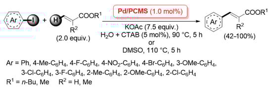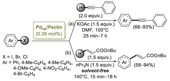 Optimized experimental conditions (DMF, KOAc, 100 °C) were then applied to a range of aryl iodides, bromides and chlorides with different functional groups. In the presence of electron withdrawing moieties, the reactions took place very fast, while longer reaction times were required with aryl bromides and iodides possessing eletron donating groups. Two aryl chlorides were coupled with phenylacetylene, affording the corresponding products in high yields. Recycling of the catalyst was performed upon the reaction of iodobenzene with phenylacetylene. Pdnp/Pectin could be easily separated from the products and reused for three successive runs with some decrease in catalytic activity. The same catalytic system was successfully applied by the authors [] in the solvent-free Mizoroki–Heck reactions of butyl acrylate with aryl halides under aerobic conditions (Scheme 14b). The catalyst was stable and could be easily separated from the products and reused six times without significant loss in activity.