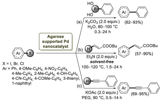 Suzuki–Miyaura, Mizoroki–Heck and Sonogashira cross-coupling reactions of aryl halides promoted by agarose supported Pd nanocatalyst, reported in 2011 and 2012 by Firouzabadi’s group [].