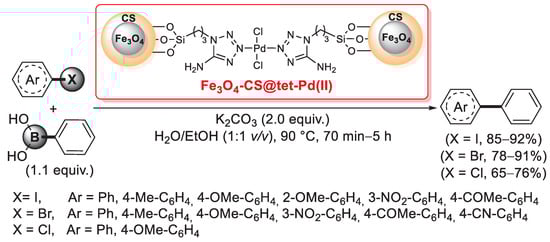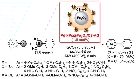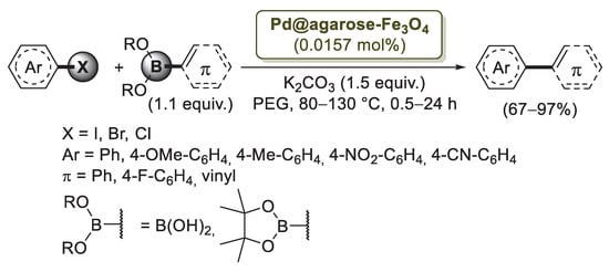 Suzuki–Miyaura reaction of aryl halides with boronic acids and pinacol esters promoted by Pd nanoparticles supported on magnetic Fe3O4 nanoparticles modified with agarose (Pd@agarose–Fe3O4), reported in 2014 by Firouzabadi and co-workers [].
