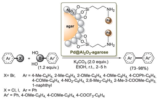 - Wang, P.; Cai, J.; Chen, J.; Ji, M. Agarose-Alumina Composite Supported Palladium Catalyst for Suzuki Coupling Reactions. J. Braz. Chem. Soc. 2015, 26, 748–754. [Google Scholar] [CrossRef]