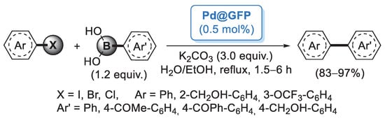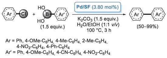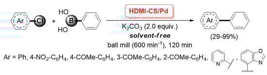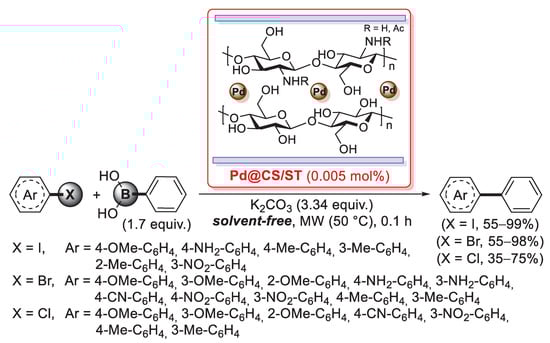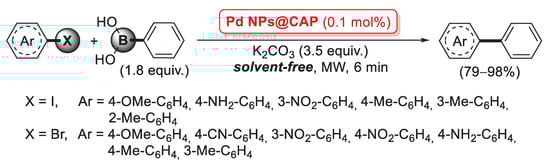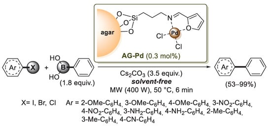 In 2018, a novel agar/pectin composite (APC) was reported by Baran as an efficient and green support for palladium nanoparticles []. APC was simply prepared by mixing a solution of pectin with a solution of agarose. Then, PdCl2 was added to the mixture and refluxed at 100 °C for 4 h to provide the complete conversion of Pd(II) to Pd(0). Pd NPs@APC was obtained as a dark grey powder after removal of the solvent. Morphological analysis indicated that palladium nanoparticles were spherical in shape and homogeneously dispersed on the APC surface. The catalytic behavior of Pd NPs@APC against Suzuki–Miyaura reactions was studied using a clean and simple method, which used K2CO3 as a base, solvent-free media, 0.15 mol% of catalyst, oxygen atmosphere and irradiation with MW at 350 W for 5 min. The coupling reactions of phenyl boronic acid and aryl iodides and bromides generated the desired cross-coupled products with excellent reaction yields (67–99%). The catalytic activity of Pd NPs@APC was also investigated in the presence of aryl chlorides. The tests showed that para-substituted CN and meta substituted −NO2 aryl chlorides provided the diaryl compounds with good yields (75–79%), while the presence of eletron donating groups determined a reduction of activity (48–61%). Finally, the reusability tests showed that Pd NPs@APC was readily recovered from the reaction media with filtration and could be reutilized for nine successive runs with a small reaction yield decrease (from 99% to 88%).