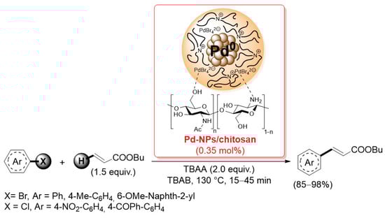 - Calò, V.; Nacci, A.; Monopoli, A.; Fornaro, A.; Sabbatini, L.; Cioffi, N.; Ditaranto, N. Heck Reaction Catalyzed by Nanosized Palladium on Chitosan in Ionic Liquids. Organometallics 2004, 23, 5154–5158. [Google Scholar] [CrossRef]