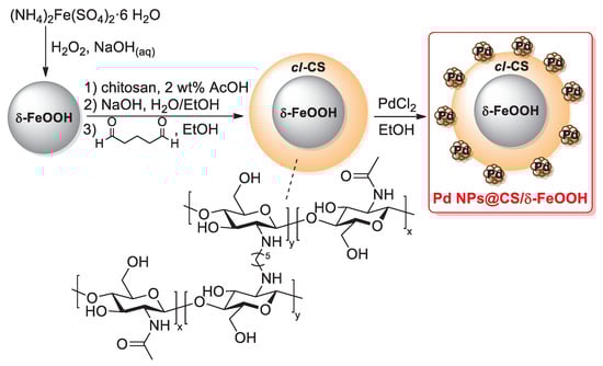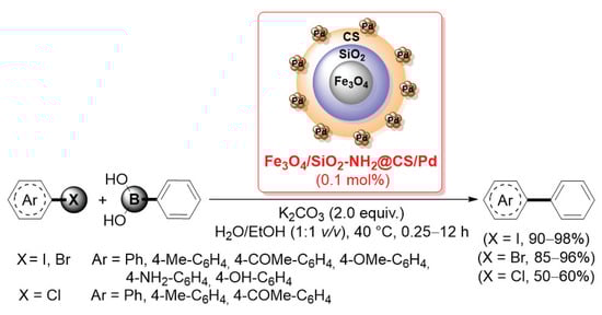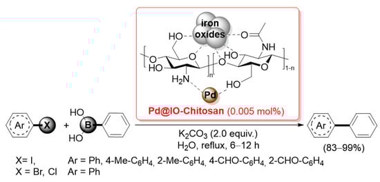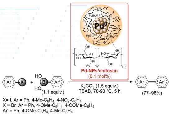 - Shaikh, N.; Pamidimukkala, P. Magnetic chitosan stabilized palladium nanostructures: Potential catalysts for aqueous Suzuki coupling reactions. Int. J. Biol. Macromol. 2021, 183, 1560–1573. [Google Scholar] [CrossRef]