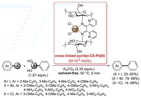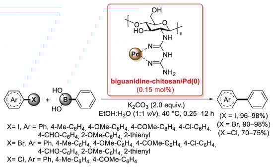 - Dong, Y.; Bi, J.; Ming, S.; Zhang, S.; Zhu, D.; Meng, D.; Li, T. Functionalized chitosan as a novel support for stabilizing palladium in Suzuki reactions. Carbohydr. Polym. 2021, 260, 117815. [Google Scholar] [CrossRef]