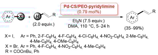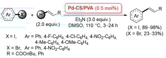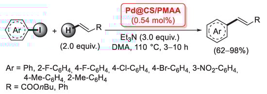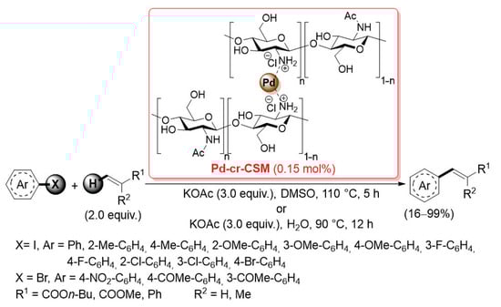 - Zhang, H.-F.; Zhang, L.; Cui, Y.-C. Synthesis of chitosan microsphere-resin supported palladium complex and its catalytic properties for Mizoroki–Heck reaction. React. Funct. Polym. 2007, 67, 322–328. [Google Scholar] [CrossRef]
