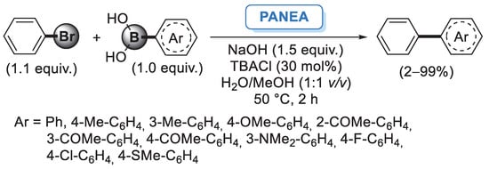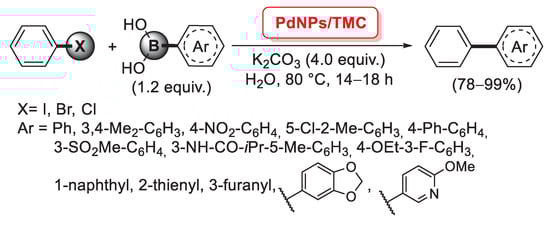According to the procedure developed by Panah’s group for the synthesis of a silica–starch substrate-derived catalyst PNP–SSS, Sodhi et al. immobilized palladium nanoparticles onto the same silica starch composite (SS) by treatment with Pd(acac)2 and NaBH4 as the reducing agent []. Data obtained from TEM analysis indicated for SS-PdNPs, an average size of Pd(0) nanoparticles around 3.5 nm. The catalytic activity of SS-PdNPs was investigated in Suzuki–Miyaura cross-coupling of 4-bromoacetophenone and benzene boronic acid chosen as model compounds. The reactions were performed in water, in the presence of K2CO3 as a base and with TBAB, which enhanced the rate of reaction by transferring haloarene to the aqueous phase and hence reacting with phenyl boronic acid faster. The optimised experimental conditions were applied to aryl bromides possessing both an eletron donating and electron withdrawing functional group. In all cases, the reactions afforded the corresponding biaryl derivatives in high yields (Scheme 13).