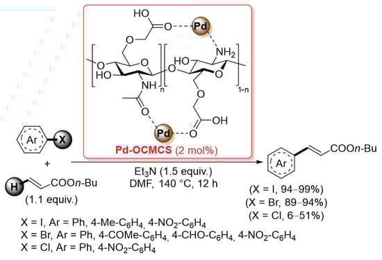 - Lv, D.; Zhang, M. O-Carboxymethyl Chitosan Supported Heterogeneous Palladium and Ni Catalysts for Heck Reaction. Molecules 2017, 22, 150. [Google Scholar] [CrossRef]
