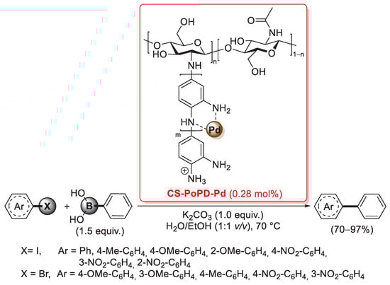 - Seyedi, N.; Zahedifar, M. Preparation and characterization of new palladium complex immobilized on (chitosan)/PoPD biopolymer and its catalytic application in Suzuki cross-coupling reaction. Appl. Organomet. Chem. 2022, 36, e6487. [Google Scholar] [CrossRef]
