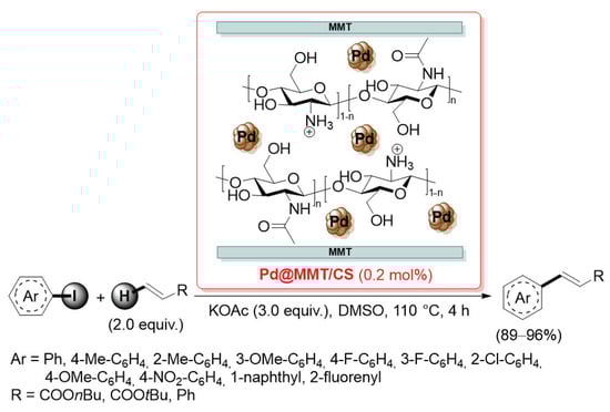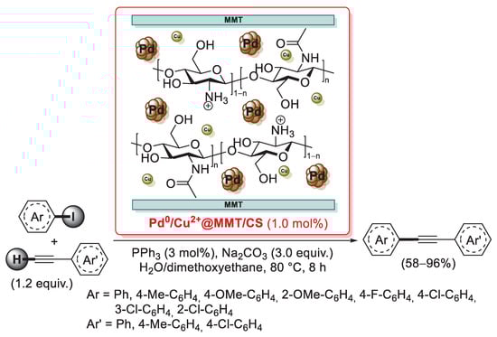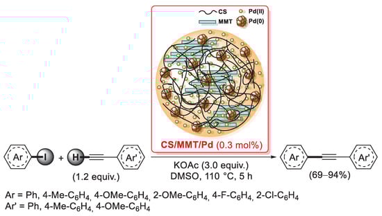- Liu, Q.; Xu, M.; Zhao, J.; Yang, Z.; Qi, C.; Zeng, M.; Xia, R.; Cao, X.; Wang, B. Microstructure and catalytic performances of chitosan intercalated montmorillonite supported palladium (0) and copper (II) catalysts for Sonogashira reactions. Int. J. Biol. Macromol. 2018, 113, 1308–1315. [Google Scholar] [CrossRef]